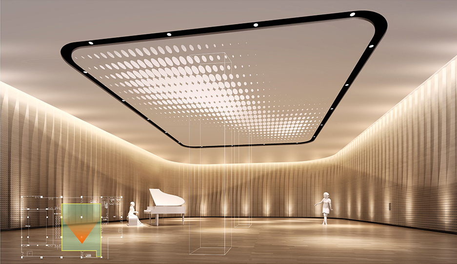 通過增加音樂廳的容積,是增加音樂廳的混響時間最有效根本的做法。因此,將吊頂設計成開放式,吊頂上部的空間屬于整個音樂廳的一部分。開放式吊頂的設計,既能讓廳堂擁有大空間廳堂的混響感,同時能保證小空間廳堂的親切感和空間感。