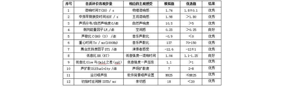 根據模擬結果,可以預測觀眾廳內任何位置無音質缺陷,如聲聚焦、回聲、顫動回聲等聲學缺陷。廳內總體評價應達到混響合適、特性優良、聲場均勻,聲音清晰豐滿、無明顯噪聲等。