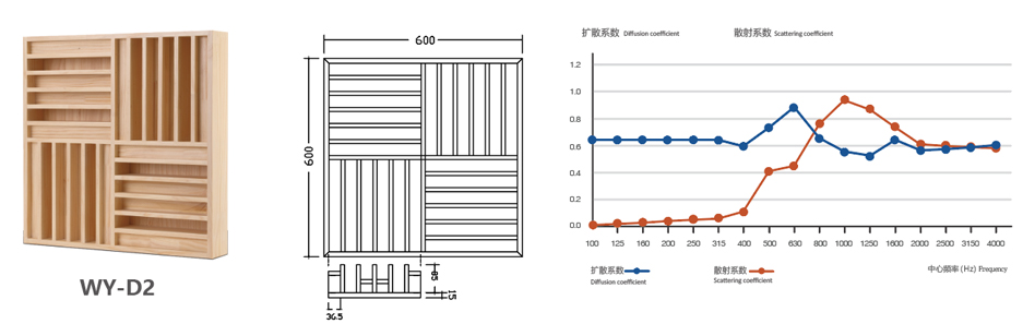 木質擴散體是一種不規則的平面設計,目的是在反射中產生擴散,它產生的聲音非常豐富而圓潤,混響聲似乎是從許多方向從側向、從頭頂以及從前方到達聽眾的,可顯著地改善廳堂的音質條件。