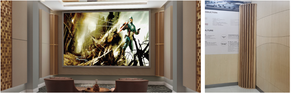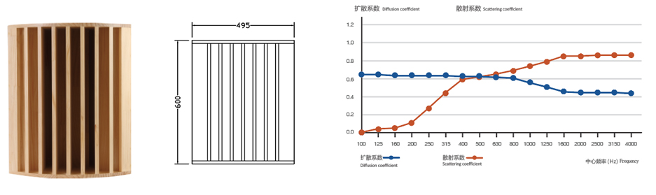 木質(zhì)擴(kuò)散體是一種不規(guī)則的平面設(shè)計(jì),目的是在反射中產(chǎn)生擴(kuò)散,它產(chǎn)生的聲音非常豐富而圓潤,混響聲似乎是從許多方向從側(cè)向、從頭頂以及從前方到達(dá)聽眾的,可顯著地改善廳堂的音質(zhì)條件。